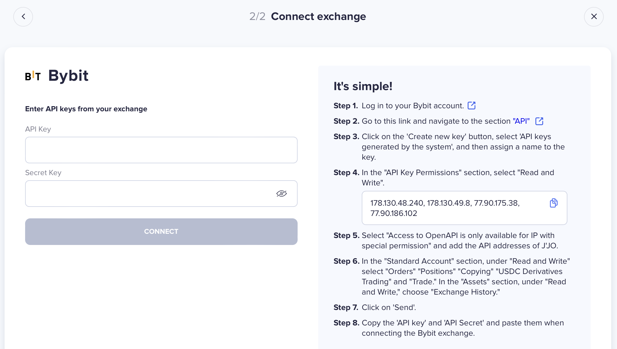 Copy the "API Key" and "Secret Key" from the exchange and paste them into the corresponding fields in your J'JO account.