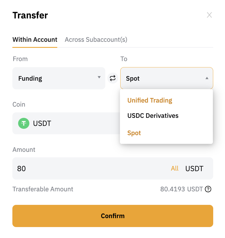 - In the window that opens, select the wallet section from which you want to transfer the coin: "Funding", for example. Also select the section you want to transfer the coin to: "Spot" or "Unified trading".