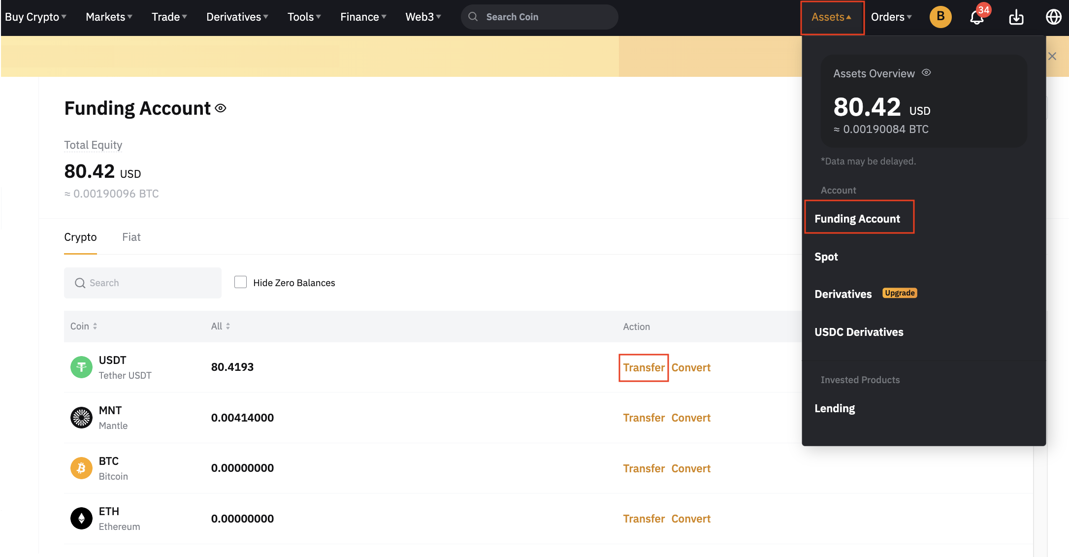 - Go to the section of your wallet called "Funding" by clicking on the "Assets" button in the upper right corner and selecting "Funding".