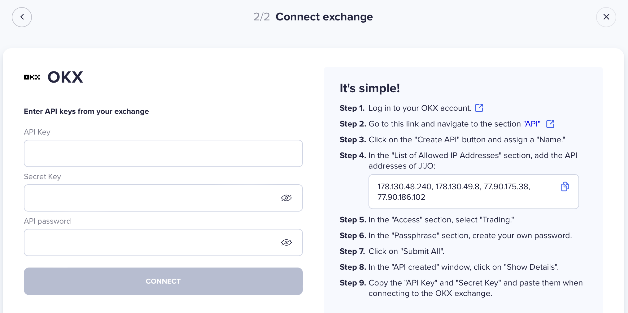 Copy the "API Key" and "Secret Key" from the exchange and paste them into the corresponding fields in your J'JO account.