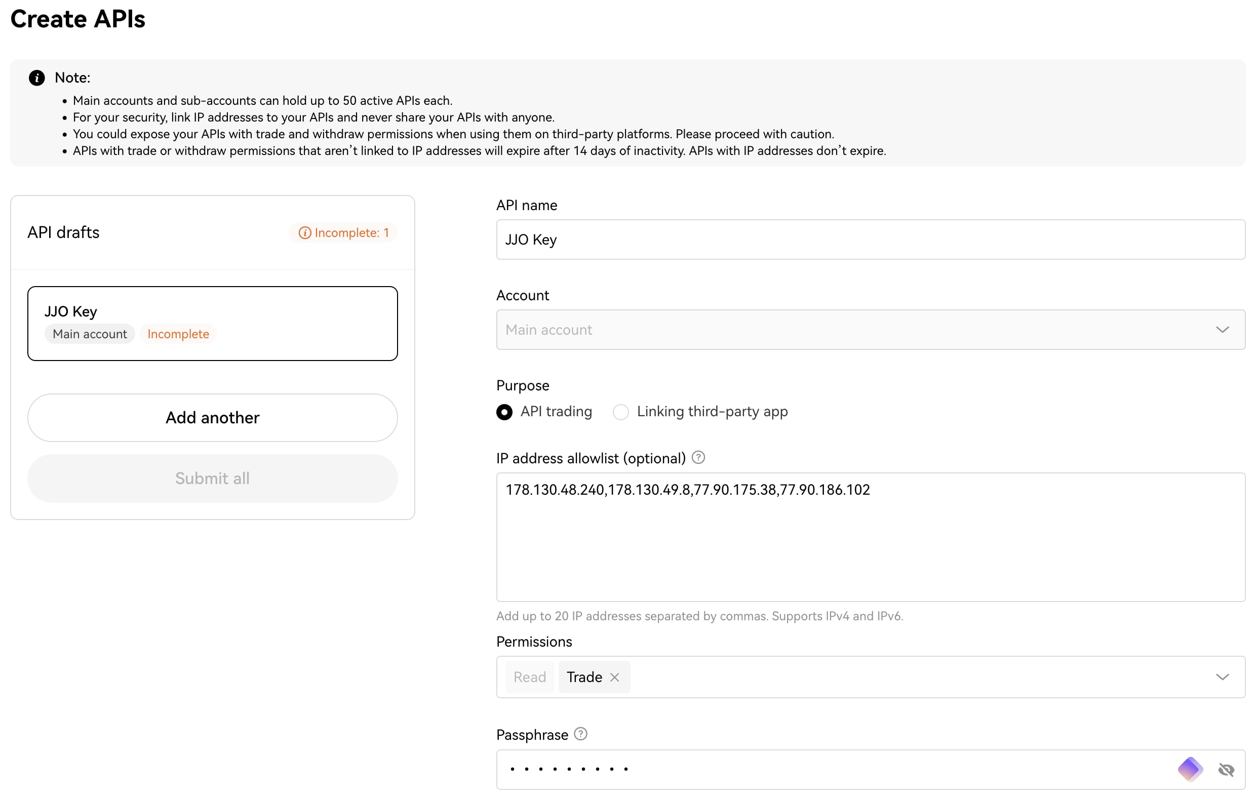 Create of any name for the key, for example "JJO" and create a password for the API key in the "Passphrase" field. This password will be used when you later link your API keys to your J'JO account. (Note that this password will be different from your "Trade password")