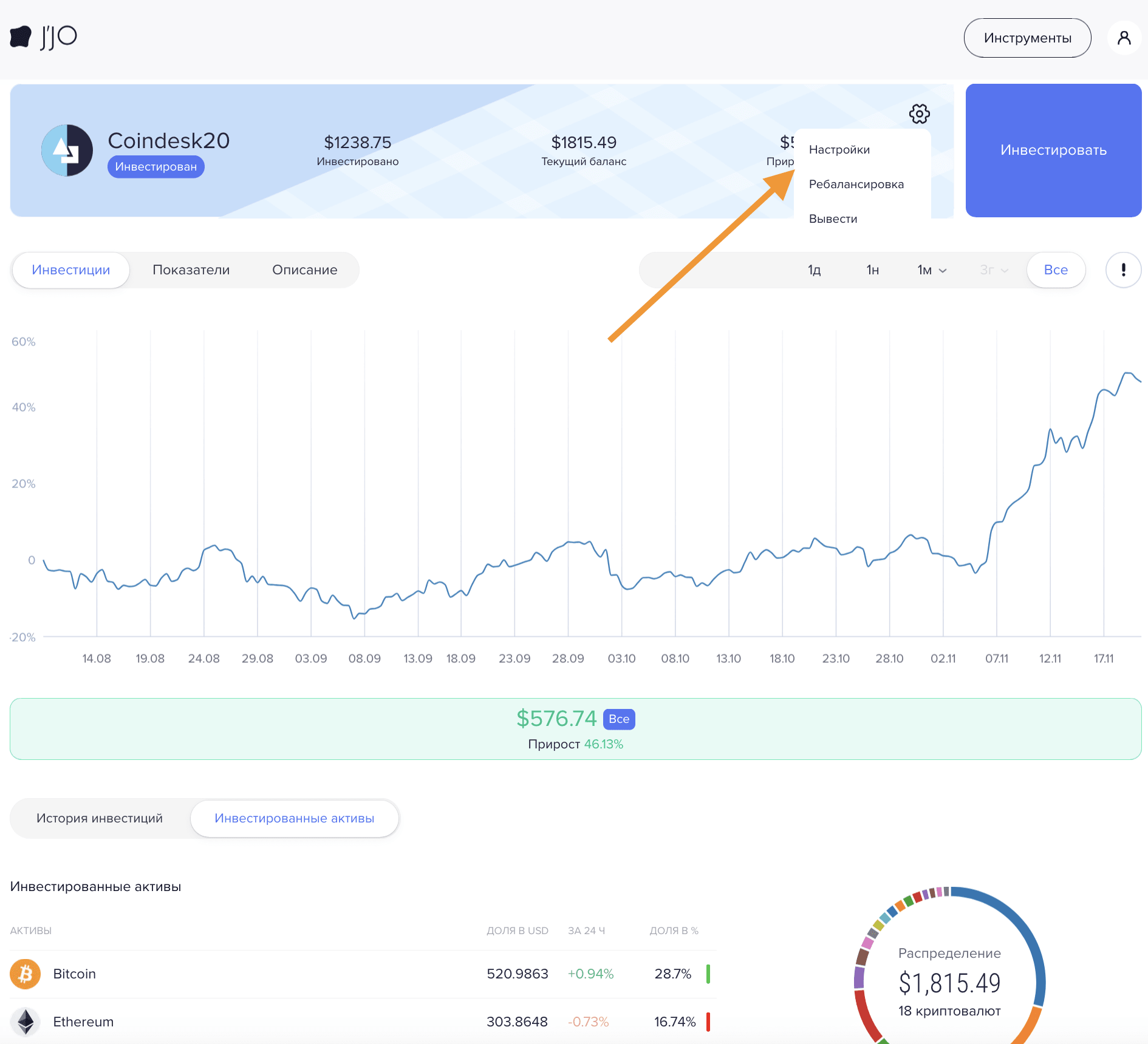 Для удаления проинвестированного портфеля/индекса сначала выведите все средства из него в одну из монет на выбор (BTC/USDT/ETH). Подробная информация о том как вывести средства из индекса/портфеля находится в статье "Как вывести средства из индекса/портфеля J’JO?".